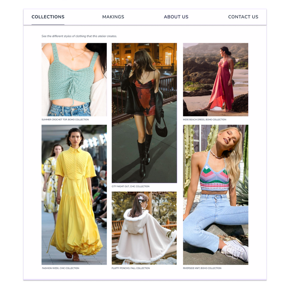 In my design, I created a portfolio that would showcase 6 images of the seller’s choosing. There would be a short description beneath each image to state what type of clothing it was and what collection it was under. If the image was clicked on, it would take clients to see more images under that specific Collection. I believed in this way it would help the seller market their brand better towards potential new clients.