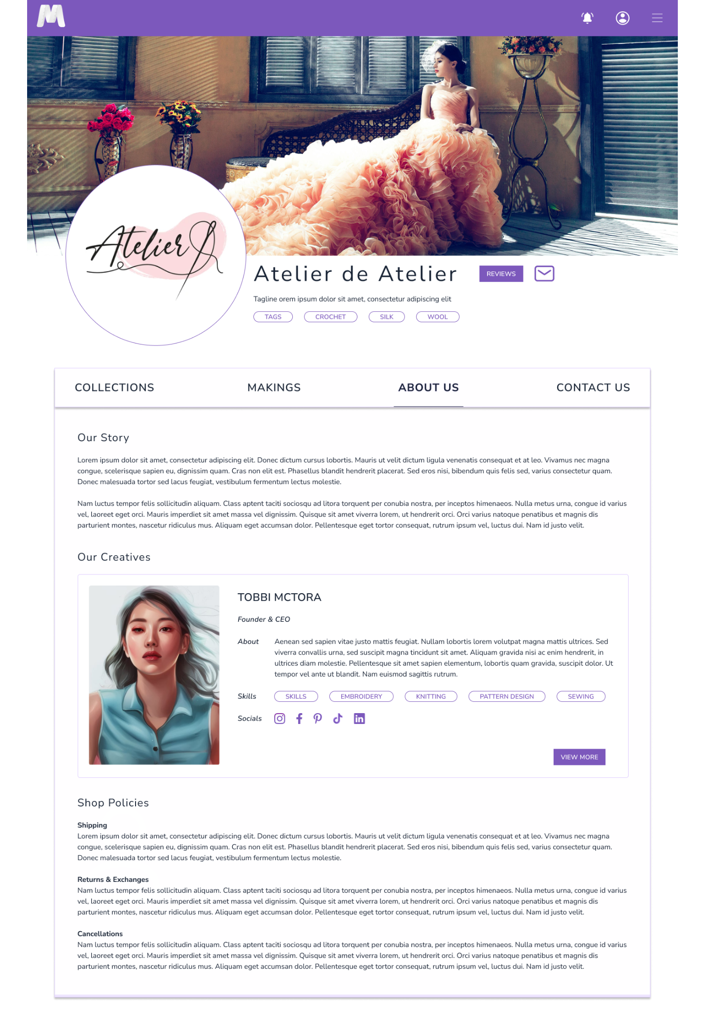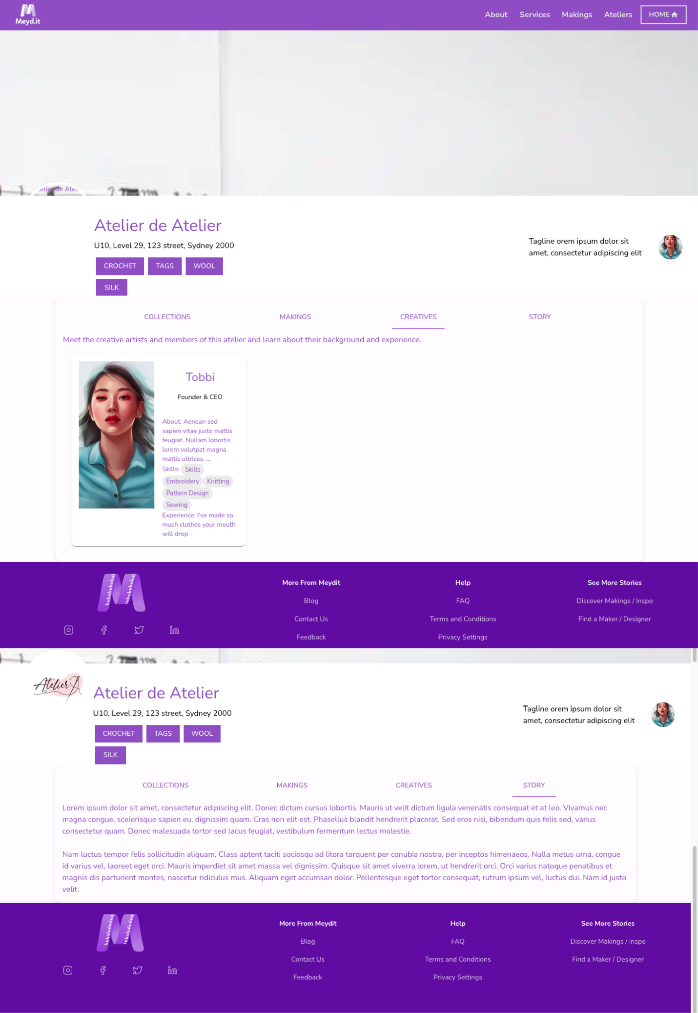 Therefore, in the new design, I added important CTA buttons such as messaging options, a specific contact us section. I combined the “Creatives” and “Story” section under “About Us” where essential information about store policies would also be available.