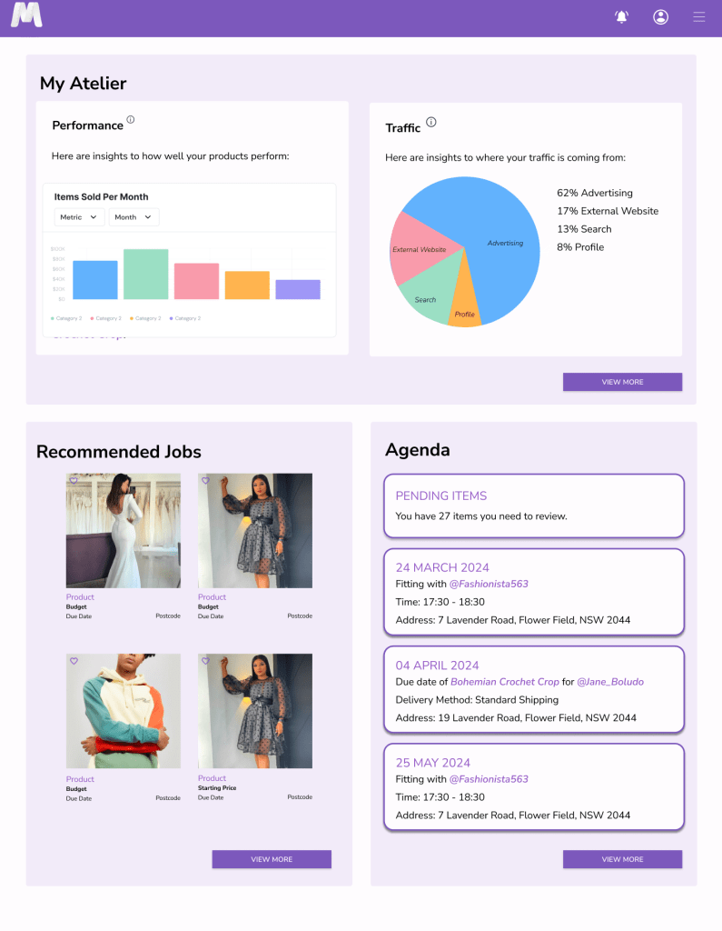 Whereas more seasoned users may require statistics on sales and traffic to assist them better in knowing which products are getting more sales, and seeing what marketing campaigns are working best etc. Additionally, making the most of Meyd.it’s back end abilities to schedule meetings and deadlines with clients, I created an “Agenda” section that would help sellers keep on top of important items.