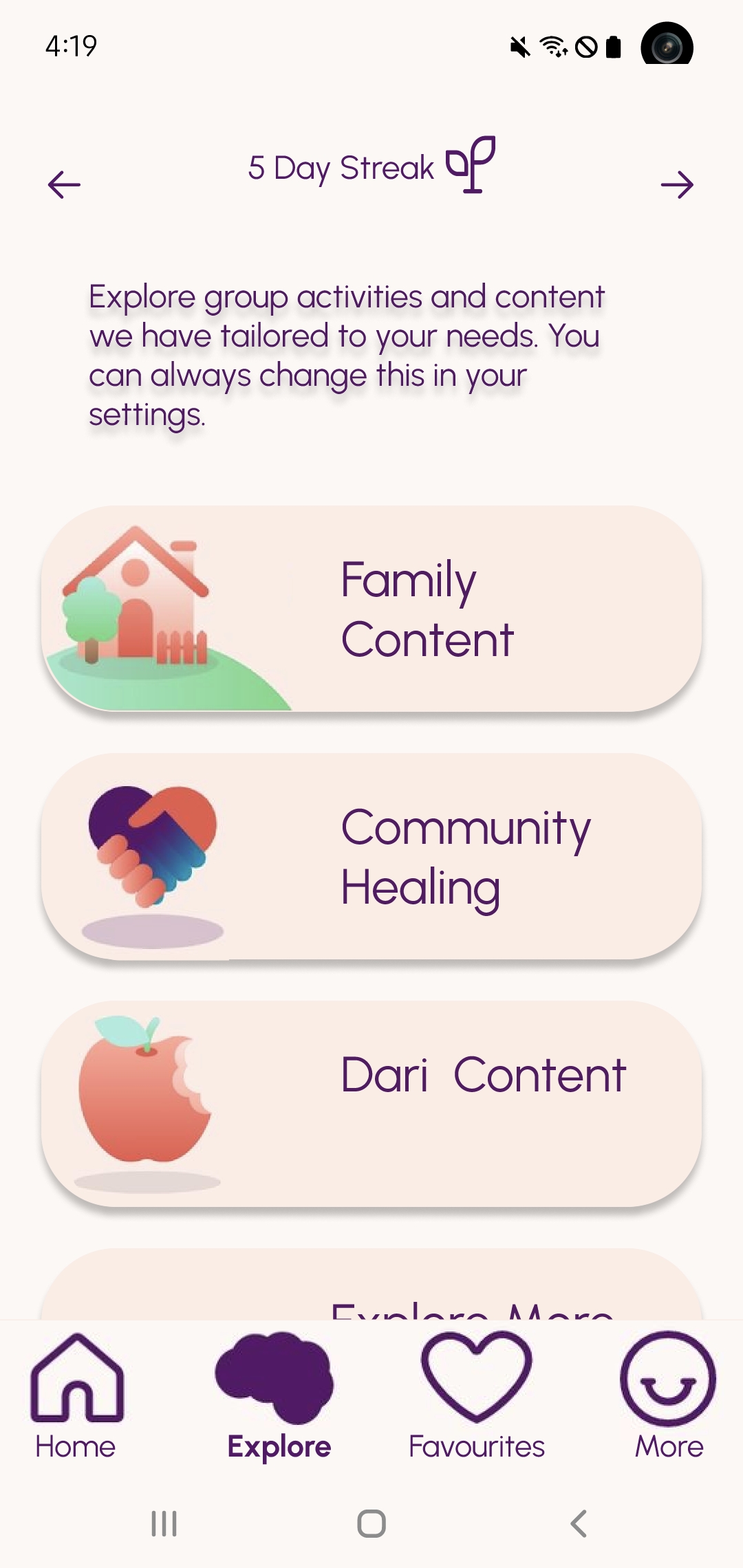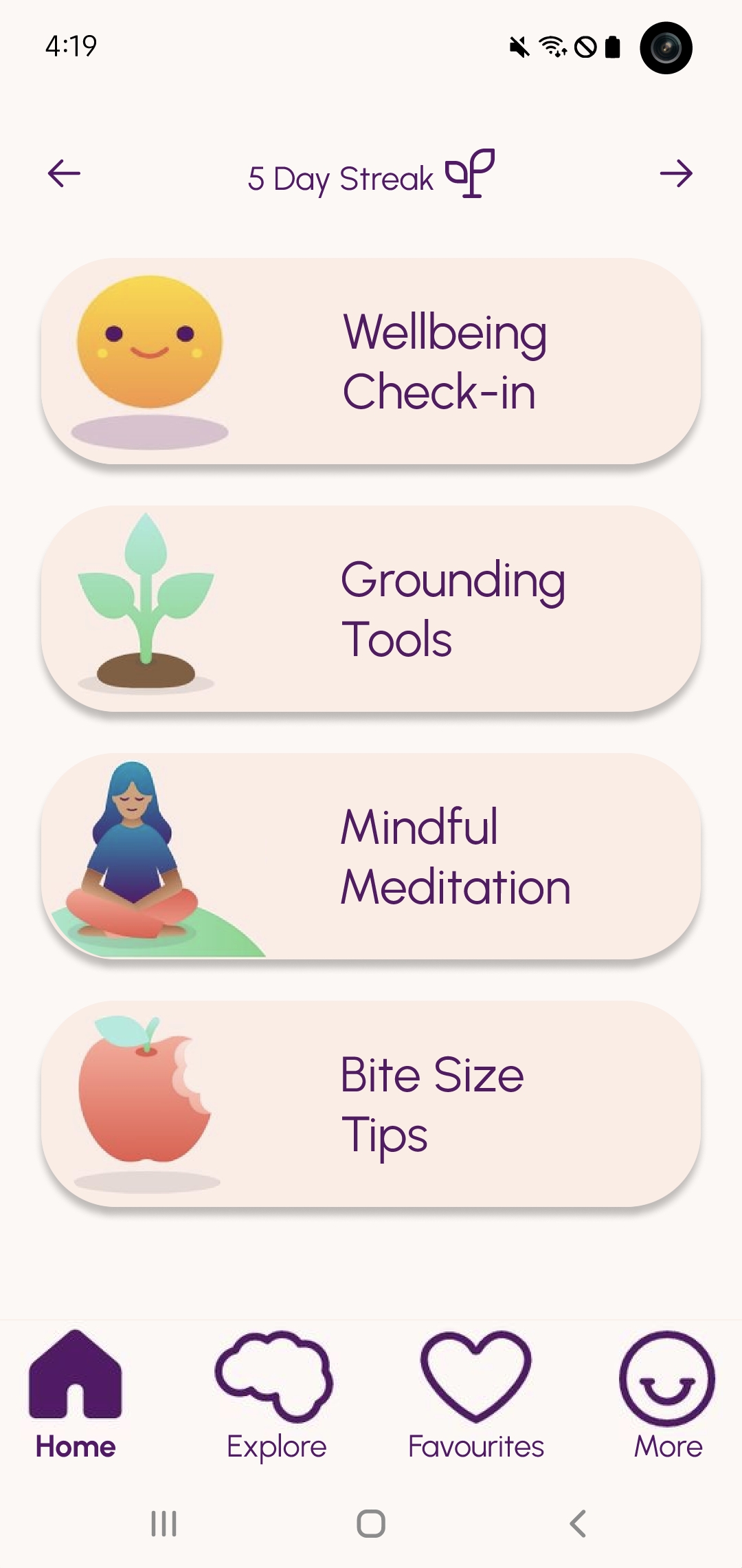 - Following each activity, users are prompted to conduct another wellbeing check-in, allowing them to assess changes in their emotions. This feature becomes particularly beneficial if they initially reported feeling distressed.
